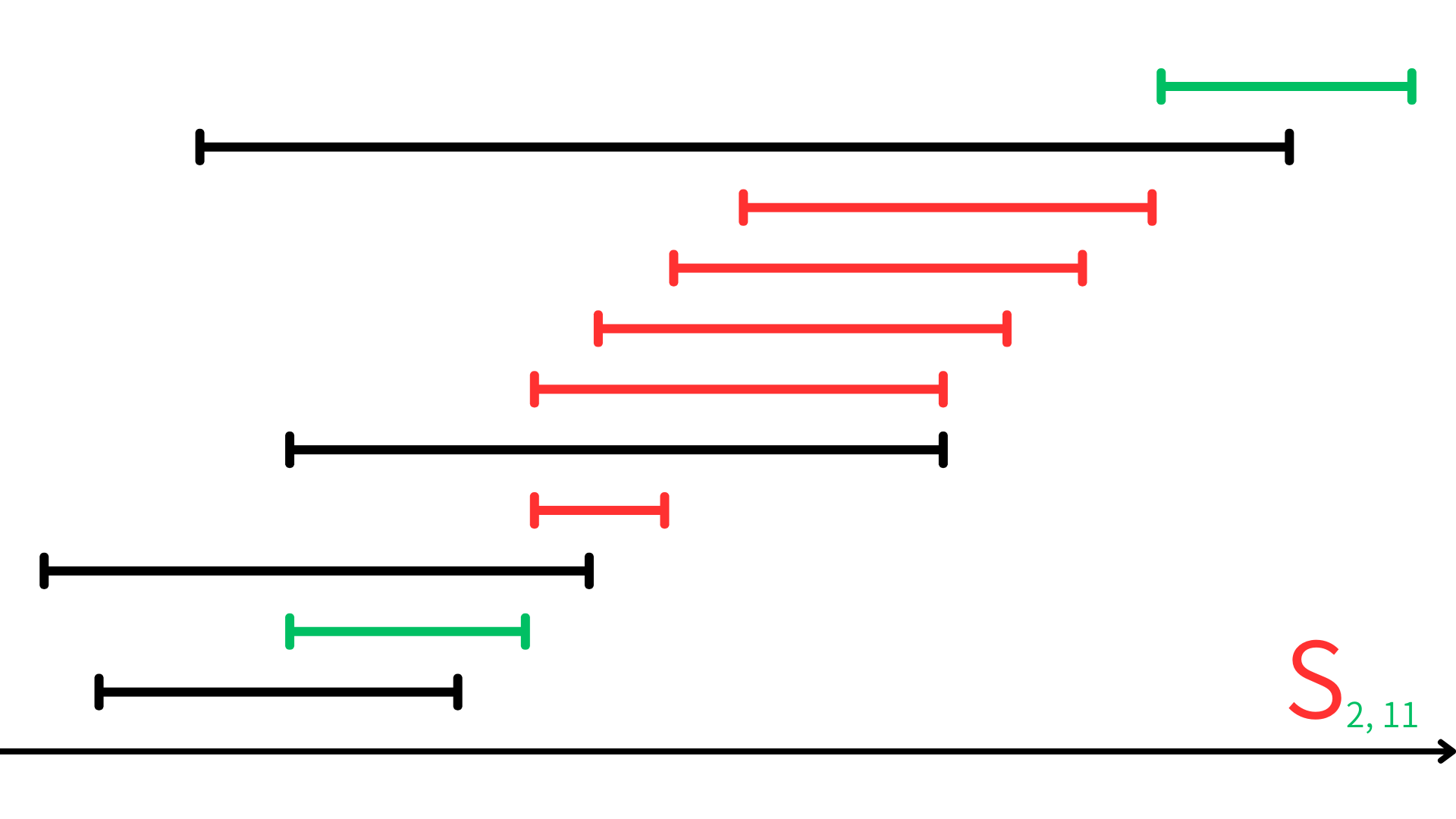 たとえば、さっきの例で $S_{2,11}$ というと、以下のようになり、$S_{2,11}=\{a_4,a_6,a_7,a_8,a_9\}$ となる。
