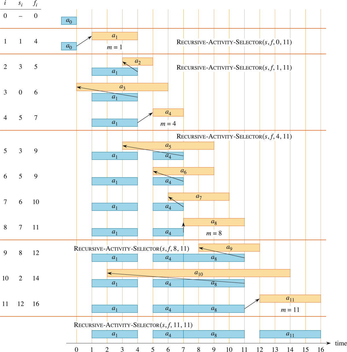活動が終了時刻に関してソート済みであると仮定すると、手続き RECURSIVE-ACTIVITY-SELECTOR(s, f, 0, n) の実行時間は $\Theta(n)$ である。なぜなら、すべての再帰呼び出しの全体を通して、各活動はちょうど1回だけ第2行の while ループの検査を受けることになるからだ。