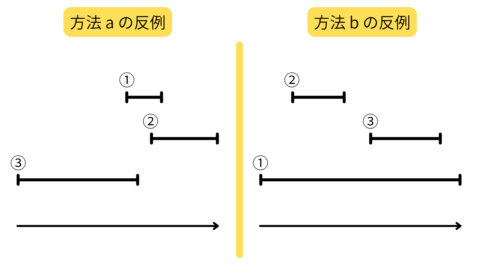 ➡ 直観的には、「できるだけ多くの活動が利用できる資源を後に残すように」すれば良さそう。つまり、「$S$ の中の終了時刻最小の活動を選択すべき」。これがこの問題の「貪欲選択」だ。