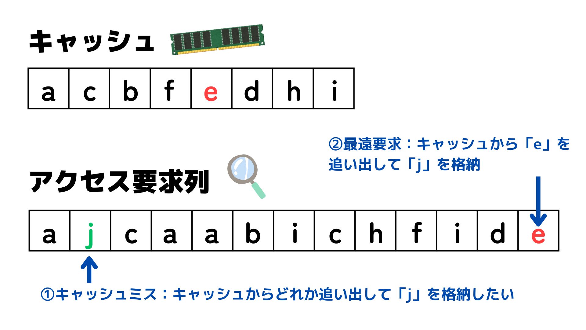 最遠要求優先戦略は、キャッシュに保存されている要素の中で、次のアクセス要求が最も遠いものから順に追い出していくという戦略だ。