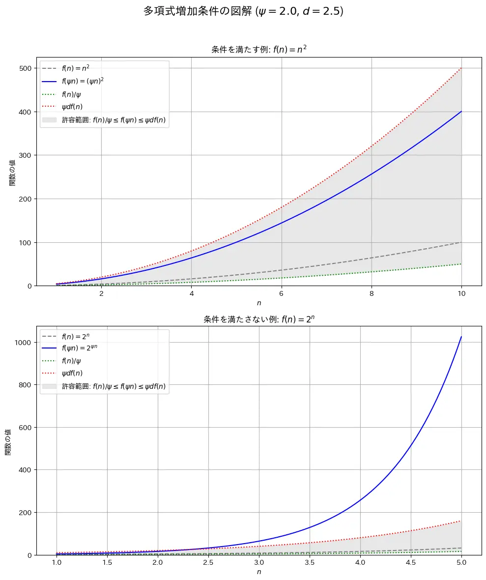 - $f(n)=2^n$ は多項式増加条件を満たさない。